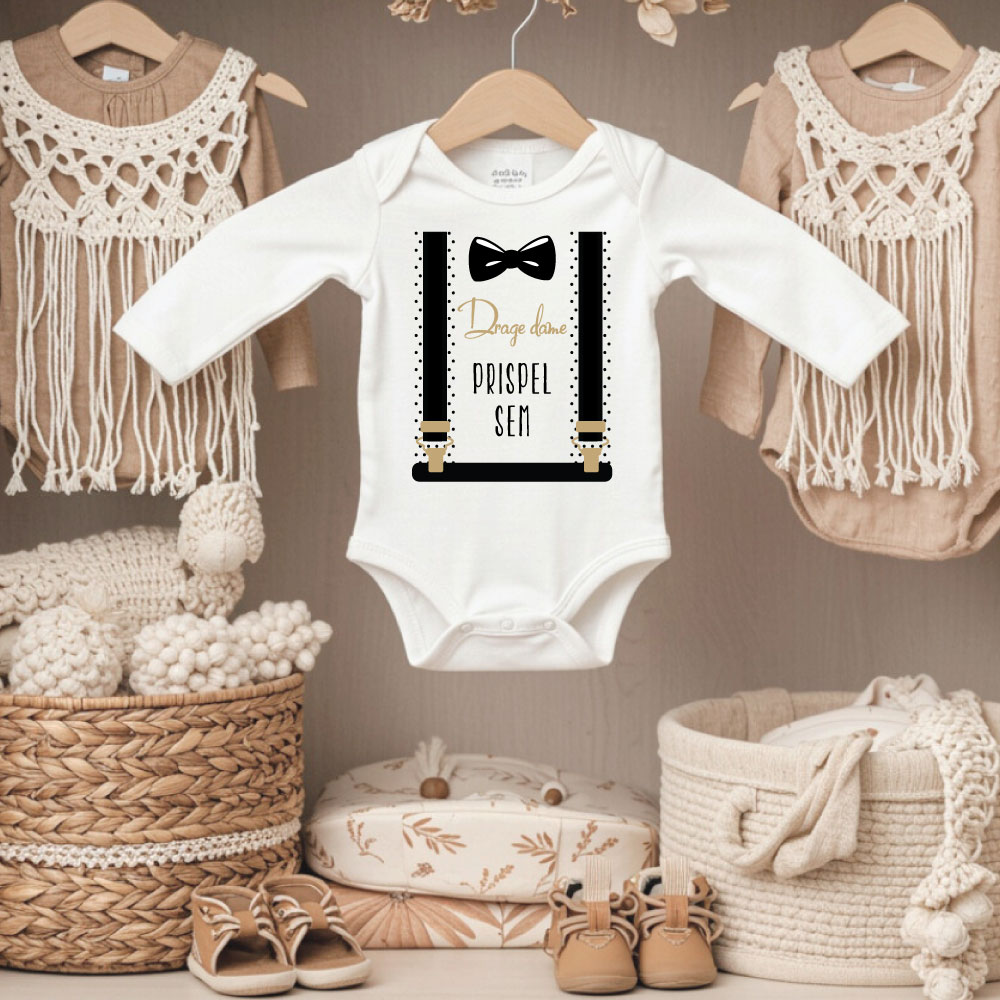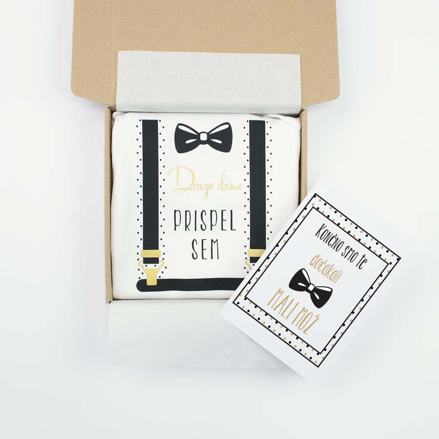 - detské body vo veľkosti 56–62 (0–3 mesiace) s nápisom „Drahé dámy, prišiel sem“