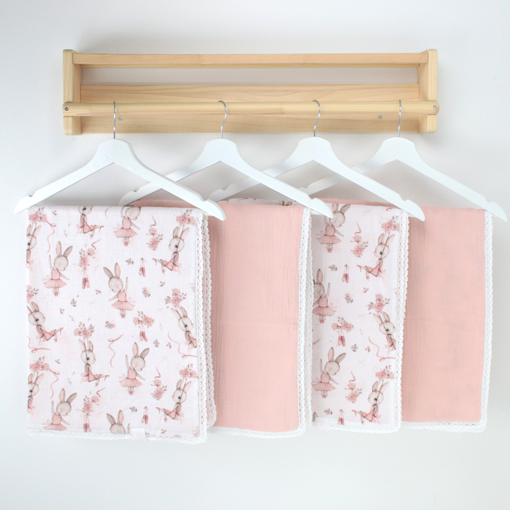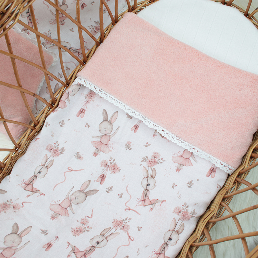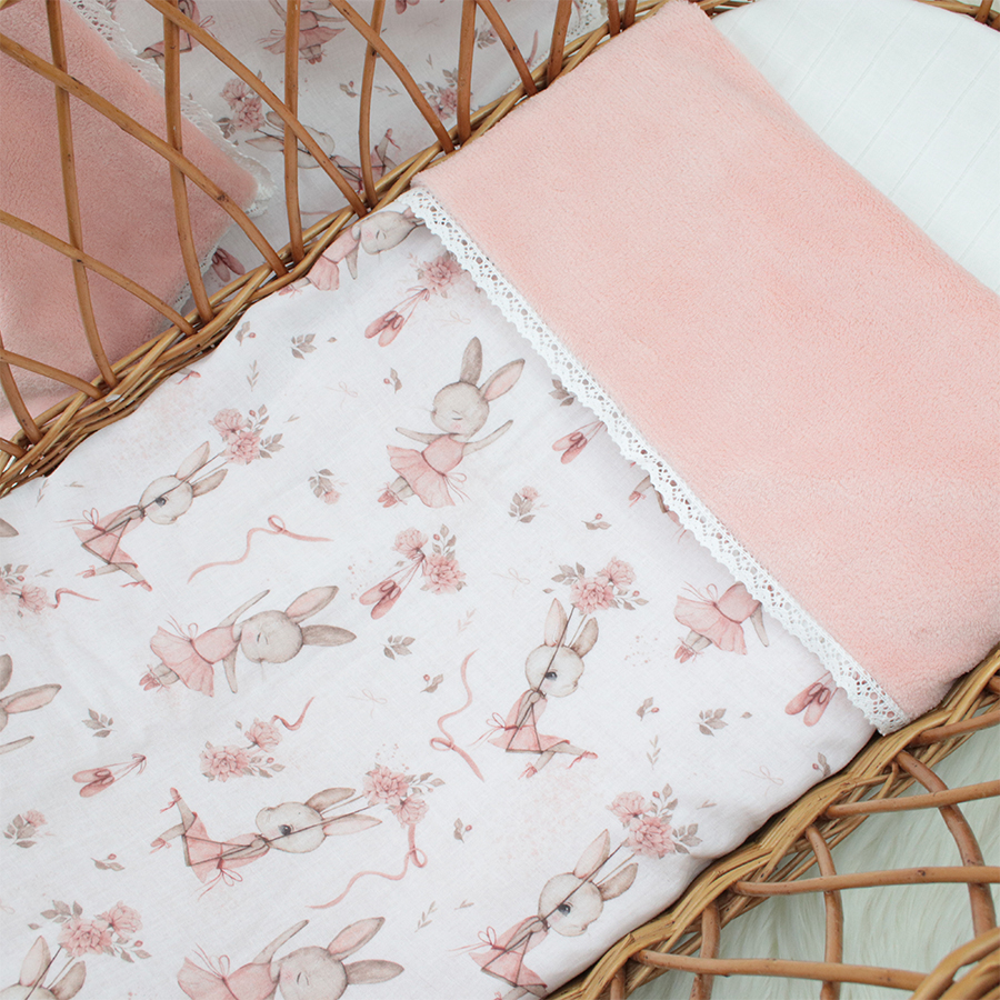 Detská deka je ručne vyrobená v Slovinsku. Skladá sa zo 4 vrstiev, na oboch stranách je priedušný dvojvrstvový mušelín, lemovaná slovinskou paličkovanou čipkou a je ideálna na teplejšie dni. K deke môžete pridať aj ručne vyrobenú a v Slovinsku prišitú plyšovú zajačiu ninku.