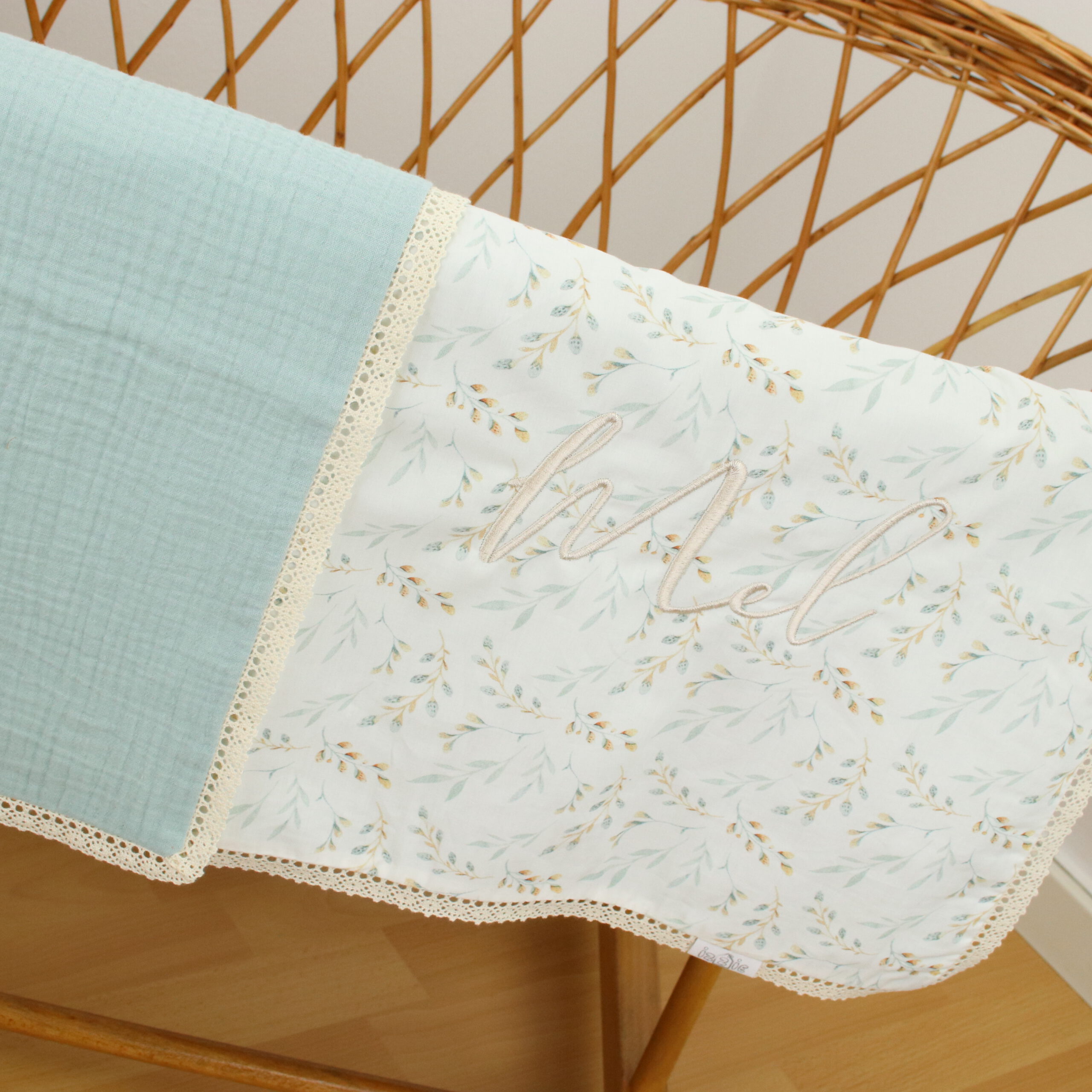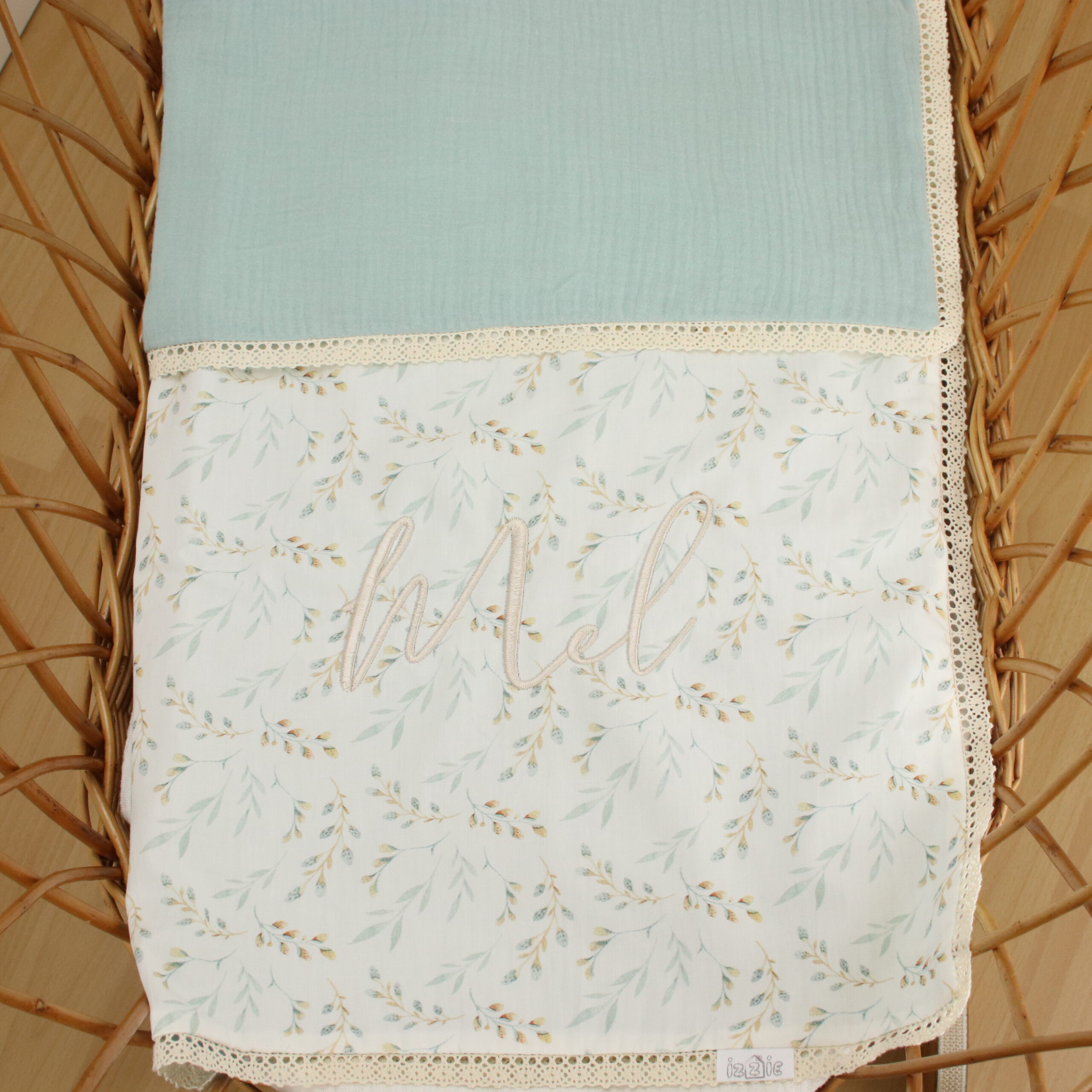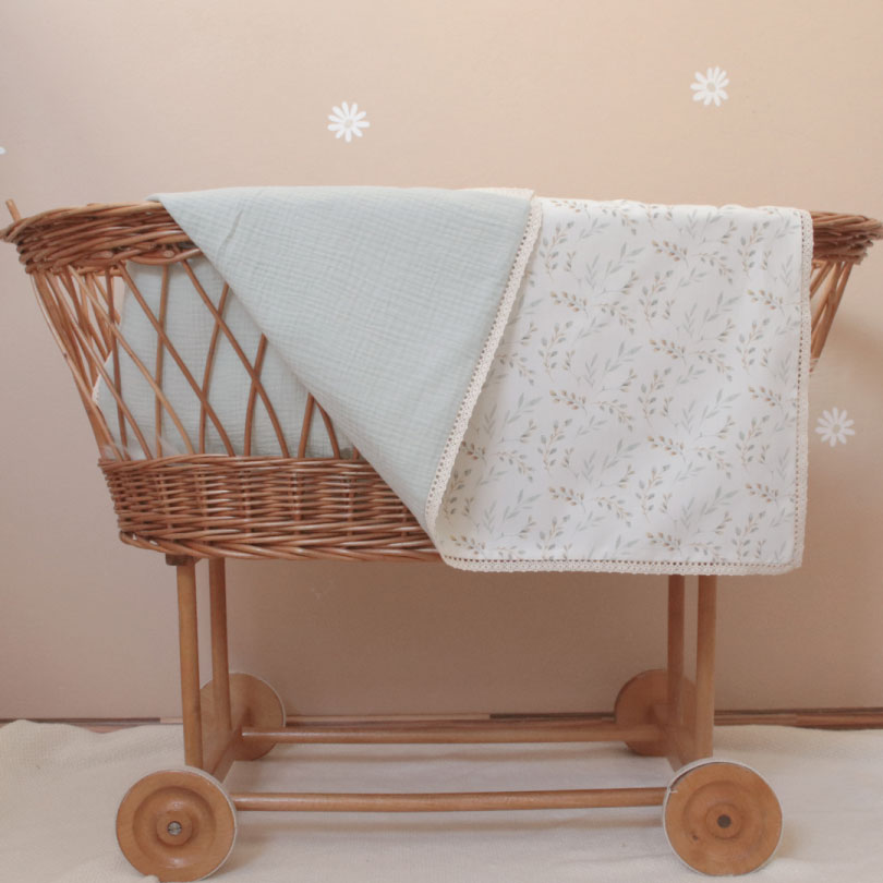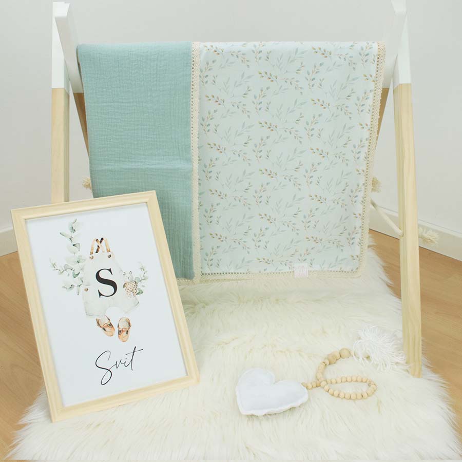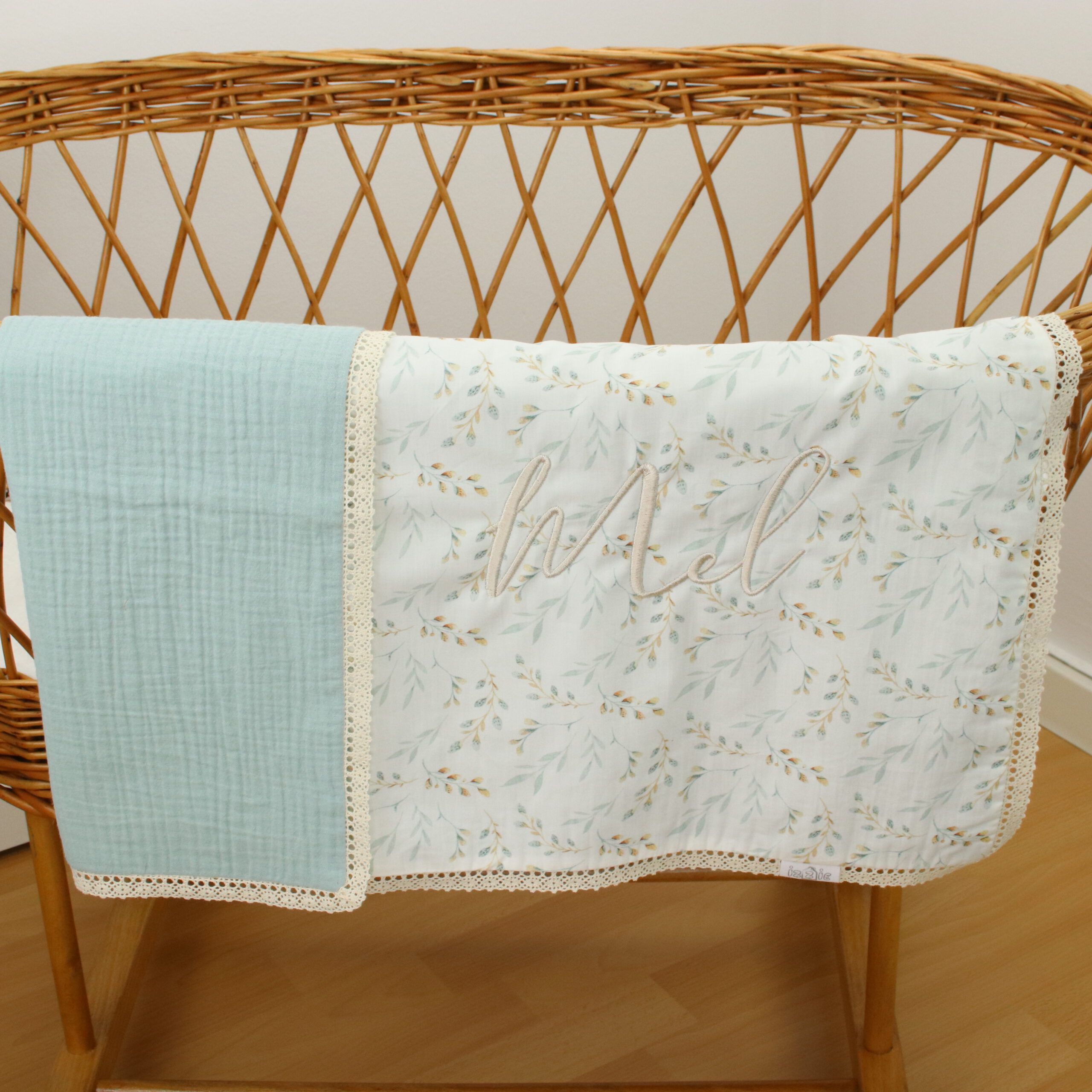 Detská tetra deka je ručne vyrobená v Slovinsku. Skladá sa z 3 vrstiev – na jednej strane je dvojvrstvový mušelín a na druhej strane bavlna. Lemovaná je slovinskou paličkovanou čipkou a je ideálna na teplé letné dni. Aby bol výrobok ešte osobnejší a cennejší, môžeme naň vyšikovať meno novorodenca zlatou niťou. K deke môžete pridať aj ručne vyrobenú a v Slovinsku prišitú plyšovú ninku pre bábätko a gumičku scrunchie pre “matchy-matchy” mamičku.